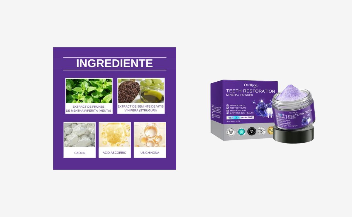 Comandă acum Pudra minerală pentru albirea dinților și bucură-te de un zâmbet mai alb, mai sănătos și mai atrăgător în doar câteva utilizări.